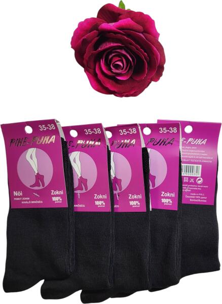 Fekete Női, normálszárú pamut zokni. Egy csomagban 5 pár zokni található. Ha 100% pamut zoknit keresel, akkor ne keresd, megtaláltad. Kényelmes, elegáns, tartós! A legjobb minőségű fonal és a legkorszerűbb kötésű technológiával készül. Fokozott igénybevételnek is megfelel. Viselete különösen javasolt állómunkát végzők, és zárt cipőt használóknak. A legszigorúbb feltételek mellett tesztelve és jóváhagyva. Minőseg: I. Osztály