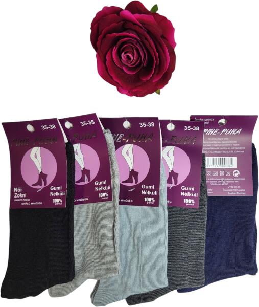 Színes Női, normálszárú, gumi nélküli pamut zokni. Egy csomagban 5 pár zokni található. Ha 100% pamut zoknit keresel, akkor ne keresd, megtaláltad. Kényelmes, elegáns, tartós! A legjobb minőségű fonal és a legkorszerűbb kötésű technológiával készül. Fokozott igénybevételnek is megfelel. Viselete különösen javasolt állómunkát végzők, és zárt cipőt használóknak. A legszigorúbb feltételek mellett tesztelve és jóváhagyva. Minőseg: I. Osztály. Pamut, puha, színes-ilyen egy jó minőségű zokni. Válaszd ki a kendvenceidet a Női zokni kollekciónkból. Kényelmes viselet a hét minden napjára, gyors szállítással magyar webshopból.