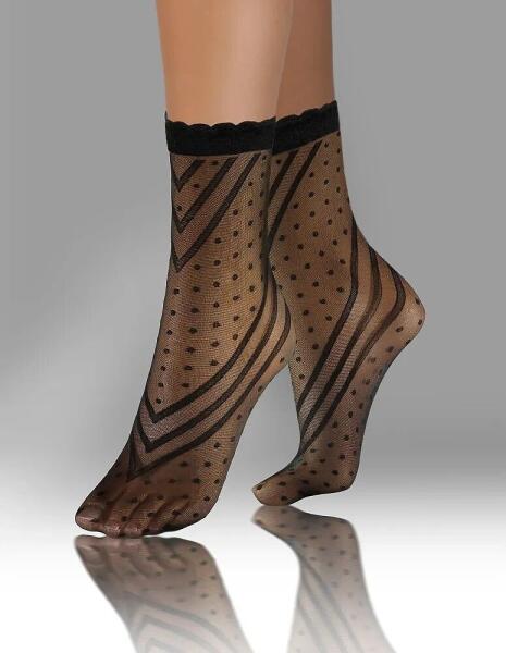 Vékony női zokni - hálós kötött - szemet gyönyörködtető mintával díszítve - nem nyomó szegély fodros kivitelben - két párba csomagolva Összetétel: 91% poliamid, 9% elasztán