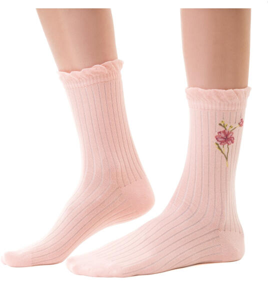 Női mintás zokni Kiváló minőségű pamut Ideális kiegészítője elegáns vagy hétköznapi ruházatnak Nem nyomó szegély fodros formában Összetétel mintától függően: 85-80% pamut, 13% poliamid, 1-5% polipropilén, 2% elasztán