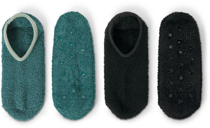 2 pár házicipő zokni Szín: 1x petrolkék, zsályazöld belépőnyílással, 1x fekete Anyag: 99% poliészter, 1% elasztán Finom puha és meleg Járótalp csúszásgátló kialakítássalRugalmas belépőnyílásMegerősített orrhegy és sarokLapos orrvarrásElasztánnal: formatartó, tökéletesen áll, rendkívül kényelmes viselet