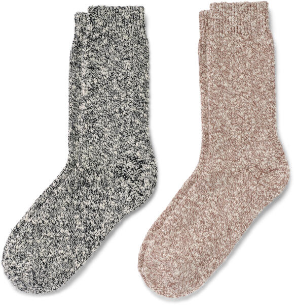 2 pár női kötött zokni, szürke/taupe Szín: 1x melírozott sötétkék, 1x melírozott szürkésbarna Anyag: 94% pamut (ökológiai gazdálkodásból származó), 5% poliamid, 1% elasztán (Creora®) Melírozott hatás a flammé fonallal készült strukturált anyagnak köszönhetőenRugalmas, bordás szegély – nem vág beMegerősített orr és sarokLapos orrvarrásElasztánnal: formatartó, tökéletesen áll, rendkívül kényelmes viseletEz a 2 pár zokni kíméli a vízkészleteket.
