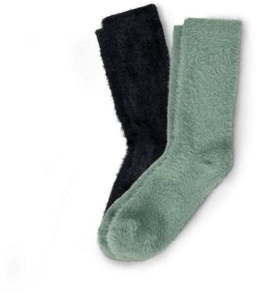 2 pár női puha zokni effektfonallal Szín: 1x fekete, 1x zsályazöld Anyag: 54% poliamid, 38% poliamid (újrahasznosított), 7% poliészter (újrahasznosított), 1% elasztán Kellemesen puhák és melegek Rugalmas szegély – nem vág beLapos orrvarrásMegerősített orr és sarokElasztánnal: formatartó, tökéletesen áll, rendkívül kényelmes viseletEzek a puha zoknik védik az erőforrásokat.
