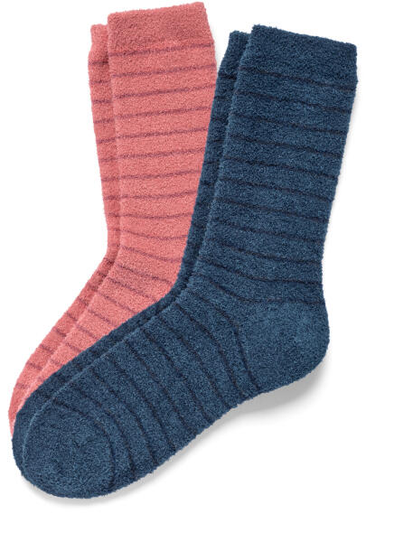 2 pár női puha zokni, csíkos, rózsaszín/kék Szín: 1x kék, 1x mályva Anyag: 99% poliészter, 1% elasztán (LYCRA®) Kellemesen puhák és melegek Rugalmas szegély – nem vág beLapos varrás a lábujjaknálMegerősített orrhegy és sarokTónusos csíkokElasztánnal: formatartó, tökéletesen áll, rendkívül kényelmes viseletet biztosít