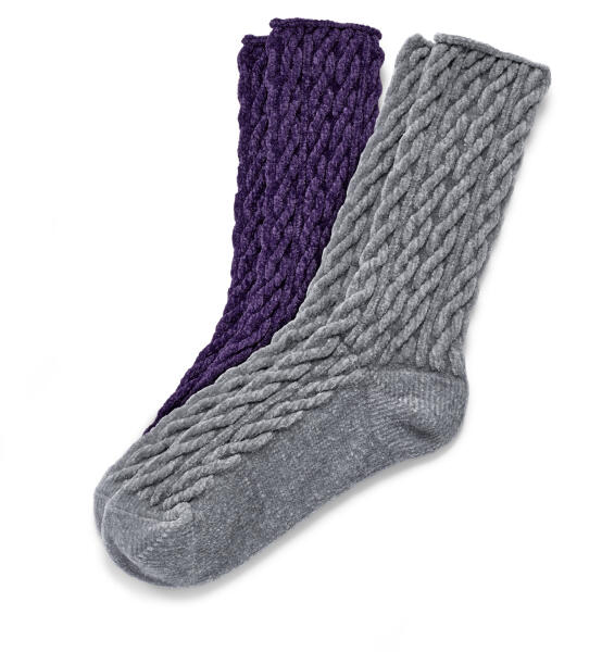 2 pár női puha zokni, szürke/lila Szín: 1x lila, 1x világosszürke Anyag: 99% poliészter, 1% elasztán (LYCRA®) Finom puha anyag zseníliafonalbólRugalmas szegély – nem vág beLapos orrvarrásMegerősített orr és sarokTeljes felületén kötött fonott mintaElasztánnal: formatartó, tökéletesen áll, rendkívül kényelmes viselet