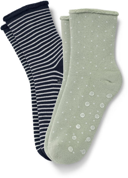 2 pár női zokni, frottír béléssel Szín: 1x sötétkék-fehér csíkos, 1x zsályazöld, fehér pöttyös Anyag: 87% pamut (ökológiai gazdálkodásból származó), 12% poliamid, 1% elasztán (Creora®) Talp csúszásgátló kialakítássalPuha, meleg plüssbélésRugalmas, csavart szegély Különösen lapos varrás a lábujjaknálMegerősített orrhegy és sarokPuha anyag biopamuttalElasztánnal: formatartók, tökéletesen állnak, rendkívül kényelmes viseletet biztosítanak