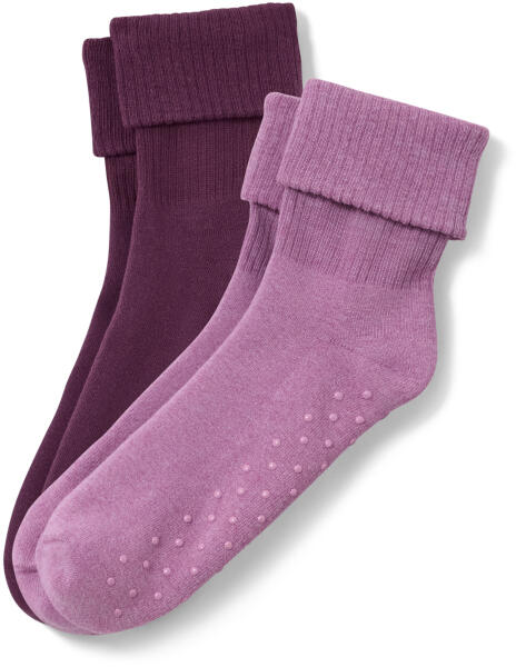 2 pár női zokni, csúszásgátló Szín: 1x melírozott orgonalila, 1x padlizsánlila Anyag: 79% pamut (ökológiai gazdálkodásból származó), 19% poliamid, 2% elasztán (Creora®) Puha, meleg plüssbélésSzéles visszahajtás – nem vág beTalp csúszásgátló kialakítássalKülönösen lapos orrvarrásMegerősített orr és sarokElasztánnal: formatartók, tökéletesen állnak, rendkívül kényelmes viseletet biztosítanakEzek a zoknik kímélik a vízkészleteket.