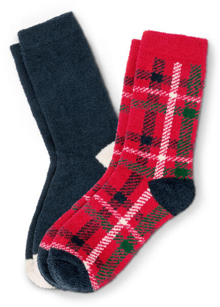 2 pár puha zokni Szín: 1x piros-krémszínű-sötétkék-zöld kockás, sötétkék orral és sarokkal, 1x sötétkék, krémszínű orral és sarokkal Anyag: 99% poliészter, 1% elasztán Kellemesen puha és meleg Rugalmas szegély – nem vág beLapos orrvarrásMegerősített orr és sarokElasztánnal: formatartó, tökéletesen áll, rendkívül kényelmes viselet