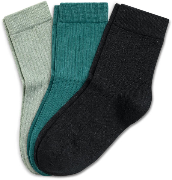 3 pár bordás kötésű zokni Szín: 1x zsályazöld, fémbevonatú fonallal, 1x petrolkék, 1x fekete, fémbevonatú fonallal Anyag: 1x 75% pamut (ökológiai gazdálkodásból), 23% poliamid, 2% elasztán (Creora®) 2x 54% pamut (ökológiai gazdálkodásból), 36% poliamid, 8% fémbevonatú fonallal, 2% elasztán (Creora®) 2 pár finoman csillogó fonallalKülönösen lapos orrvarrás Kényelmes szegély – nem vág be Megerősített orr és sarok Elasztánnal: formatartók, tökéletesen állnak, rendkívül kényelmes viseletet biztosítanakPuha anyag biopamuttal