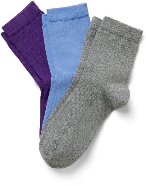 3 pár bordás kötésű zokni Szín: 1x lila, 1x kék, 1x melírozott szürke Anyag: 75% pamut (ökológiai gazdálkodásból), 23% poliamid, 2% elasztán (Creora®) Puha anyag biopamuttalKülönösen lapos orrvarrás Kényelmes szegély – nem vág be Megerősített orr és sarok Elasztánnal: formatartó, tökéletesen áll, rendkívül kényelmes viselet