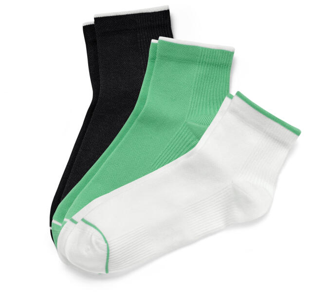 3 pár női zokni szettben, fehér/zöld/antracit Szín: 1x fehér, 1x világoszöld, 1x antracit Anyag: 63% pamut (ökológiai gazdálkodásból származó), 33% poliamid (újrahasznosított), 4% elasztán (LYCRA®) Stabilizáló kötött betoldások a lábközéprészenKompakt kötés - sportoláshoz is ideálisFélmagas szárKülönösen lapos varrás a lábujjaknálMegerősített orrhegy és sarokEzek a zoknik védik a vízkészleteket.
