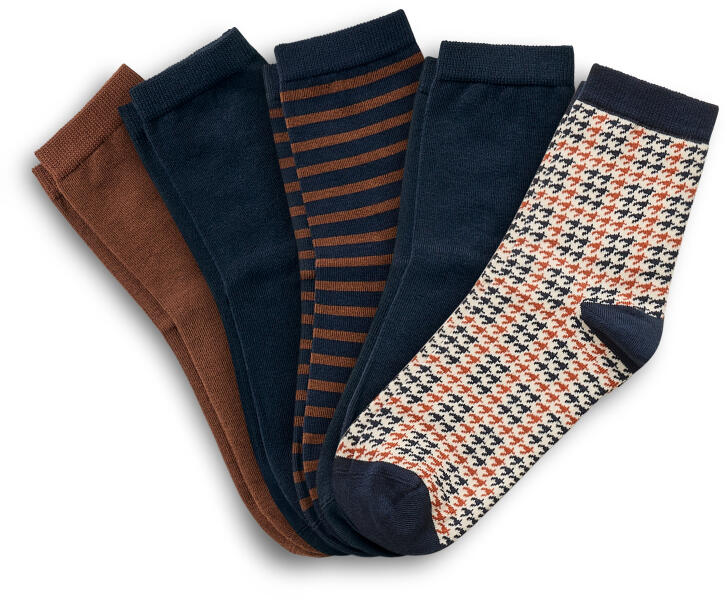 5 pár női zokni Szín: 2x sötétkék, 1x színes, belekötött tyúklábminta, 1x sötétkék-konyak csíkos, 1x konyakszínű Anyag: 80% pamut (ökológiai gazdálkodásból származó), 18% poliamid, 2% elasztán (Creora®) Puha anyagKényelmes szegély – nem vág be Különösen lapos orrvarrás Megerősített orr és sarokElasztánnal: formatartó, tökéletesen áll, rendkívül kényelmes viselet1 pár egész felületén belekötött tyúklábmintávalBiopamuttal