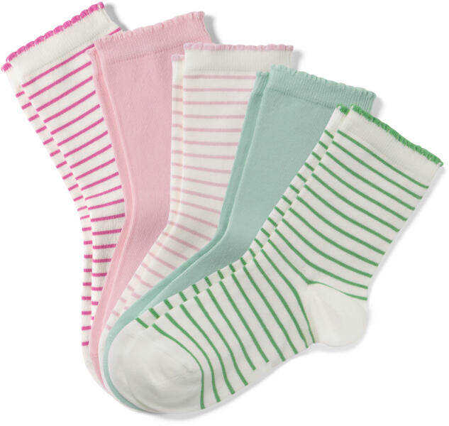 5 pár zokni Szín: 1x krémfehér-rózsaszín csíkos, 1x világosrózsaszín, 1x krémfehér-világosrózsaszín csíkos, 1x menta, 1x krémfehér-világoszöld csíkos Anyag: 75% pamut (ökológiai gazdálkodásból származó), 23% poliamid, 2% elasztán (Creora®) Keskeny, kényelmes, hullámos szélű szegélyNői zoknik különösen lapos orrvarrással Megerősített orr és sarok Puha anyag biopamuttalElasztánnal: formatartó, tökéletesen áll, rendkívül kényelmes viseletet biztosítEzek a zoknik védik a vízkészleteket.