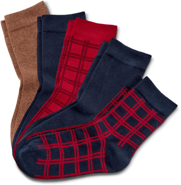 5 pár zokni Szín: 2x sötétkék 1x sötétkék, piros kockás mintával 1x piros, tónusos kockás mintával 1 x melírozott barna Anyag: 75% pamut (ökológiai gazdálkodásból származó), 23% poliamid, 2% elasztán (Creora®) Különösen lapos varrás a lábujjaknál Kényelmes szegély – nem vág be Megerősített orrhegy és sarok 2 pár teljes felületén belekötött kockás mintávalPuha anyag biopamuttalElasztánnal: formatartó, tökéletesen áll, rendkívül kényelmes viseletet biztosít