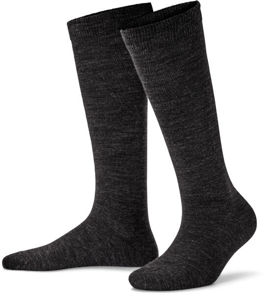 Női térdzokni, merinógyapjúval, sötétszürke Szín: Melírozott sötétszürke Anyag: 69% gyapjú (merinógyapjú), 26% pamut (ökológiai gazdálkodásból), 3% poliamid, 2% elasztán (Creora®) Puha, hőmérséklet-kiegyenlítő merinógyapjúRugalmas szegély – nem vág beKülönösen lapos orrvarrásMegerősített orr és sarok Ez a termék 69% RWS tanúsított gyapjút tartalmaz, CU 809415 szerint tanúsítottElasztánnal: formatartó, tökéletesen áll, rendkívül kényelmes viseletEz a pár térdzokni ügyel a juhok jóllétére.